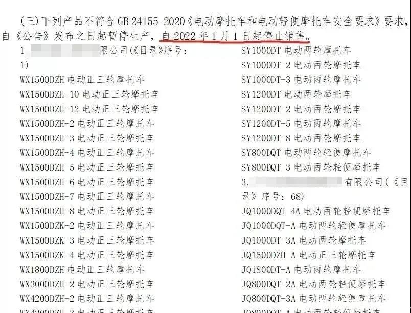提醒经销商:尽快检查库存车辆,不符合新标准GB 24155-2020的电轻摩、电摩产品,2022年1月1日起停止销售。