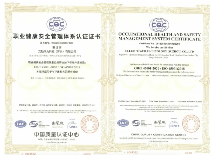 在新客户增加、产销量喜人的同时,艾勒动力还在持续完善管理体系,为企业的可持续、健康化发展铺平道路,继获得IATF16949汽车质量管理体系认证和ISO9001质量管理体系认证后,再获GB/T24001-2016 / ISO14001:2015环境管理体系认证证书、GB/T45001-2020 / ISO45001:2018职业健康安全管理体系认证证书!