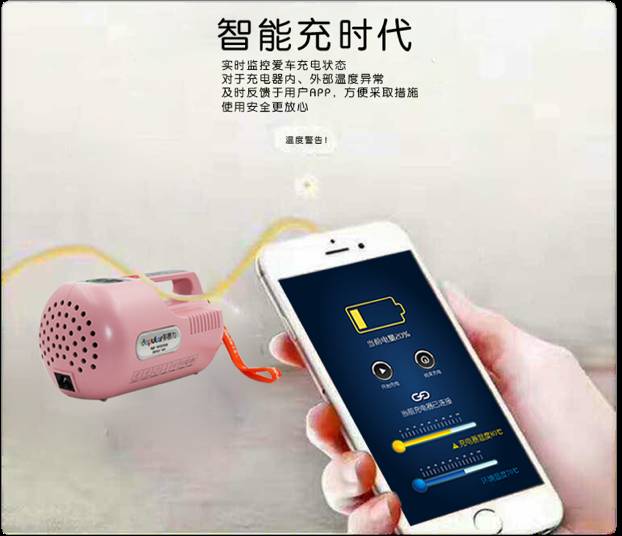 这是一款具有火灾预警及可远程操控的智能充电器,充电器内置三个温度监测点,实时监测内、外部温度,使用手机APP实现对充电器多方面操作,监测爱车充电状态,并通过移动端提醒使用者,极高的提升用户体验感。智能+互联技术,让你进入智能充时代。同时,它还能给电动车充电,如果骑行途中没电了,它能帮助你在骑行5—10km,电动车终于也有了充电宝!